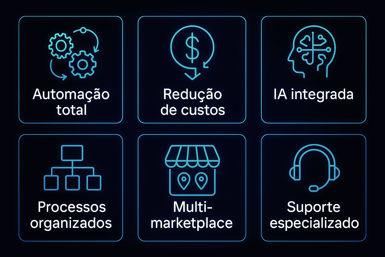 - Parametrizamos o ERP BHZ, conectamos marketplaces, fretes e fluxos financeiros conforme a sua operação.